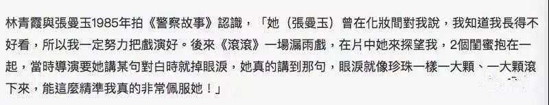 于是,自知不够漂亮的张曼玉对着林青霞说:“知道自己长得不好看,所以一定努力把戏演好。”她开始钻研自己的表演,不愿再做花瓶。