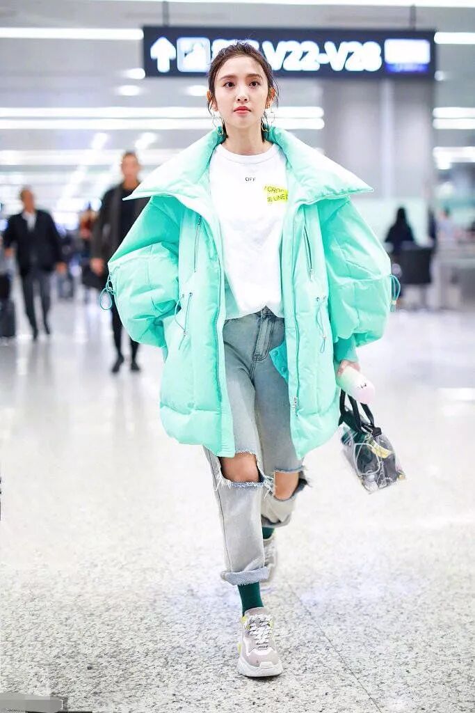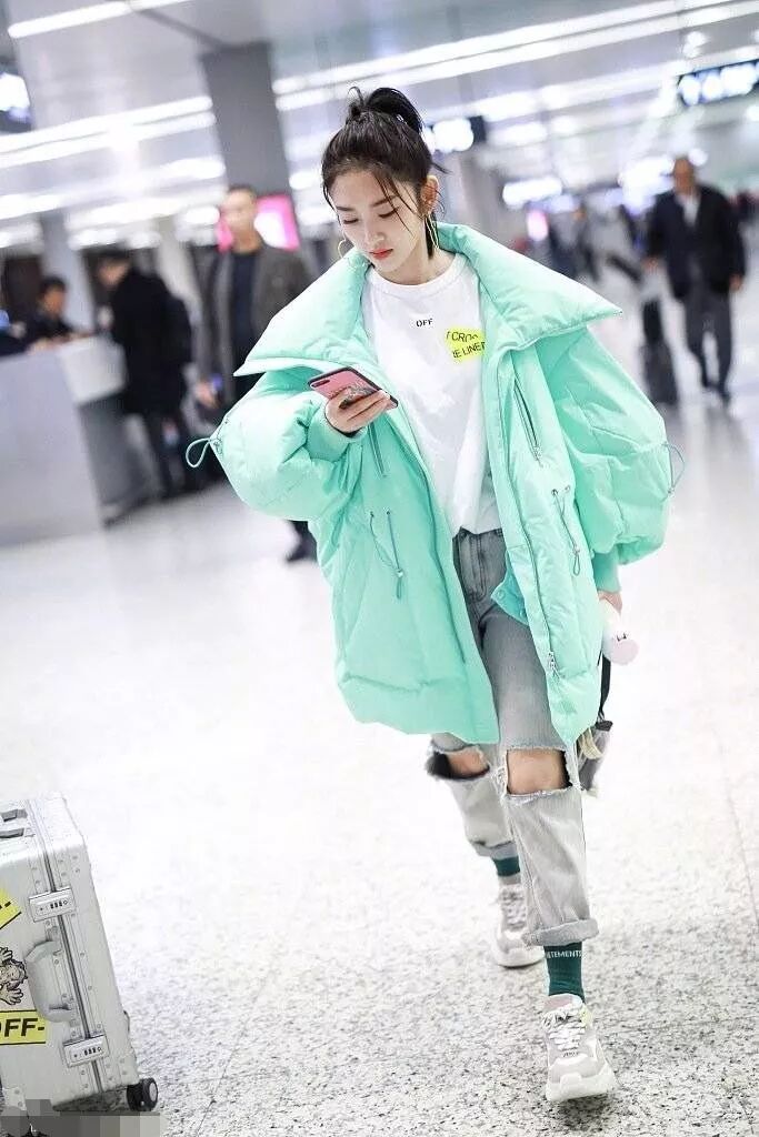 唐艺昕上半身里面配的是白色的基础款圆领长袖,外套一件非常大的糖果色的面包服,这种粉粉嫩嫩的绿色真的让她看上去年轻漂亮。