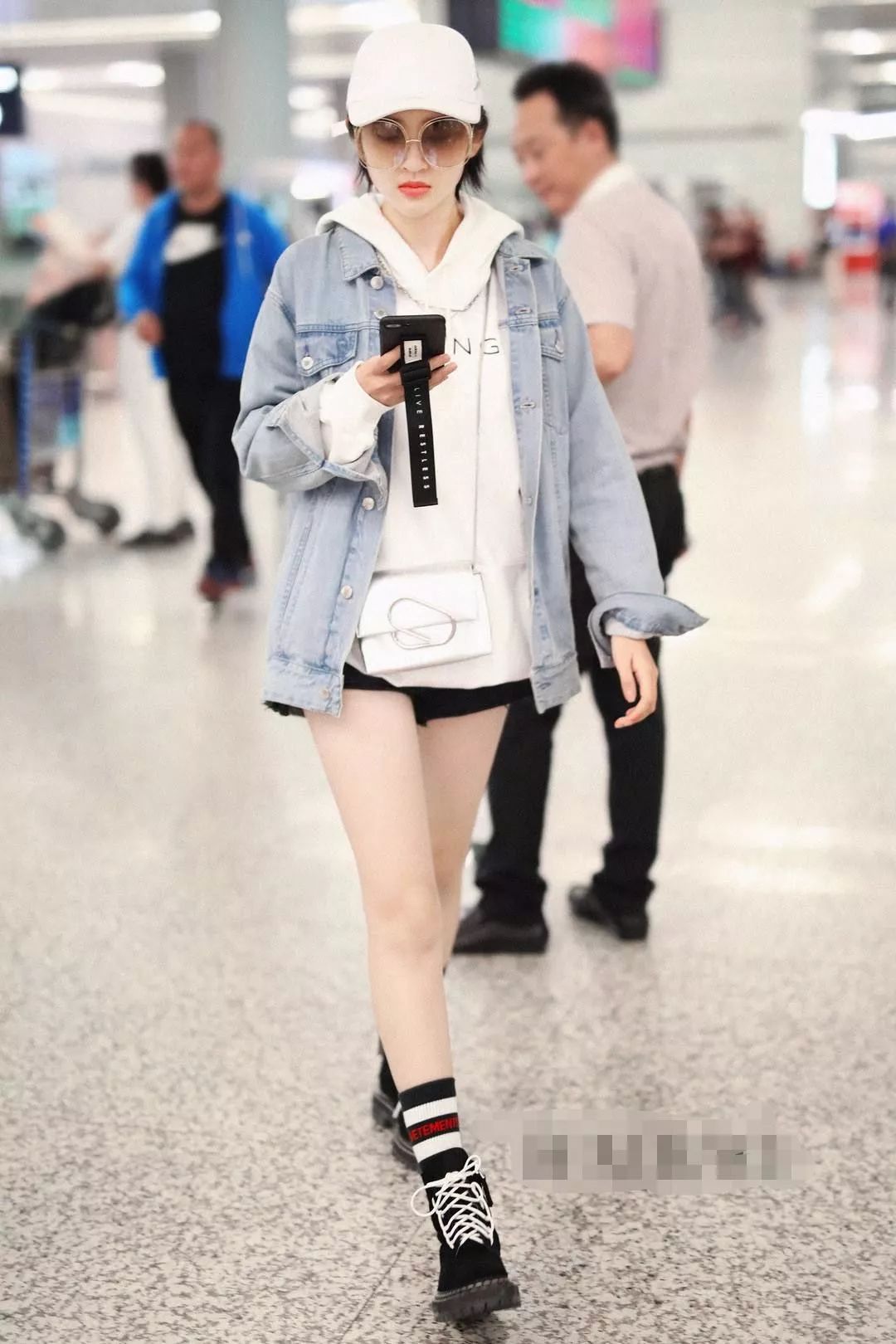 这一套衣服唐艺昕用了下衣失踪的办法,下身搭配一条黑色的超短裤,这样特别显腿长,在配上非常可爱的黑白条纹的袜子和黑色靴子,真的太好看了。