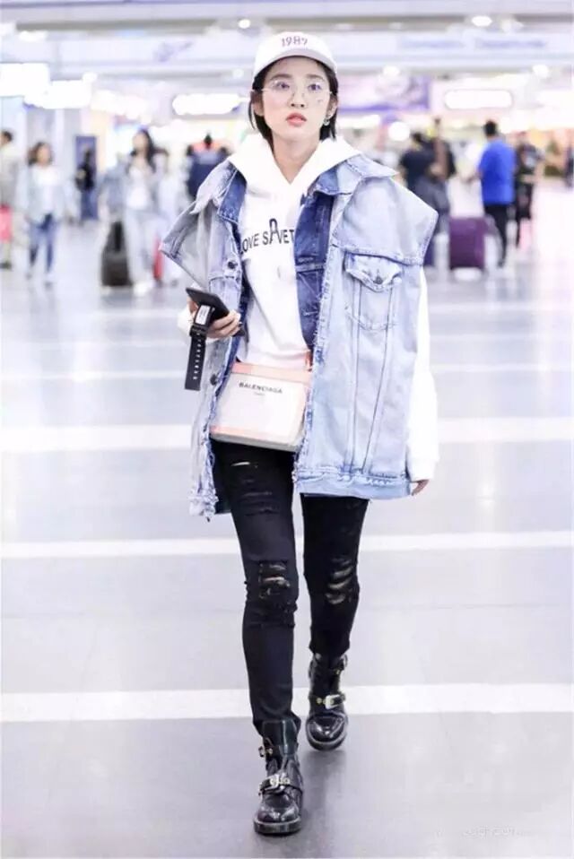 外套是非常有个性的做旧的水洗蓝牛仔衣,内搭白的戴帽子卫衣,下身配上破洞黑色紧身牛仔裤,和一双小皮鞋。休闲又舒适。