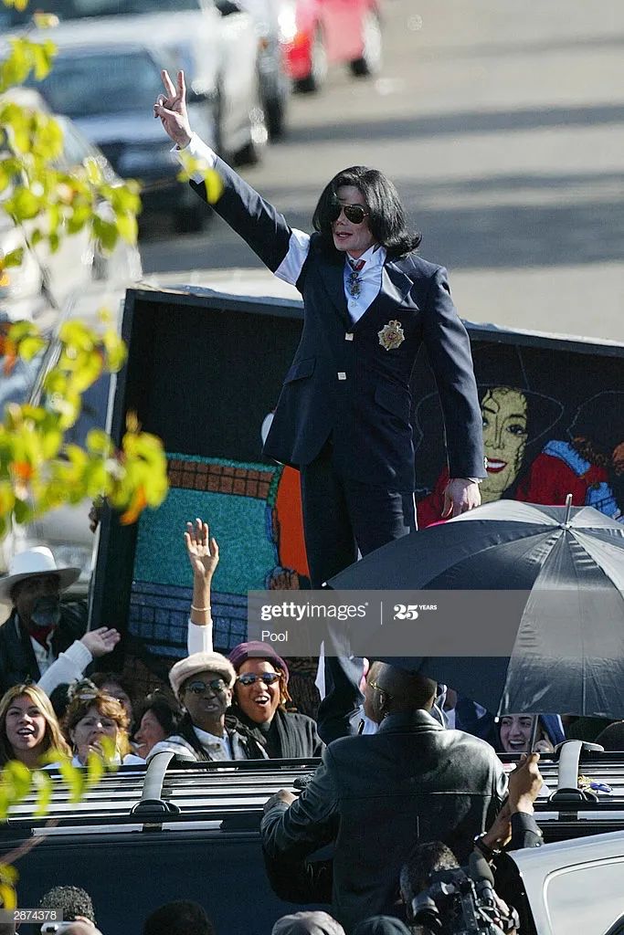 2005年6月13日,Michael在法庭被判多项有关娈童的罪名均不成立后,站在车顶上向粉丝致意。这也是非常著名的新闻图片之一。