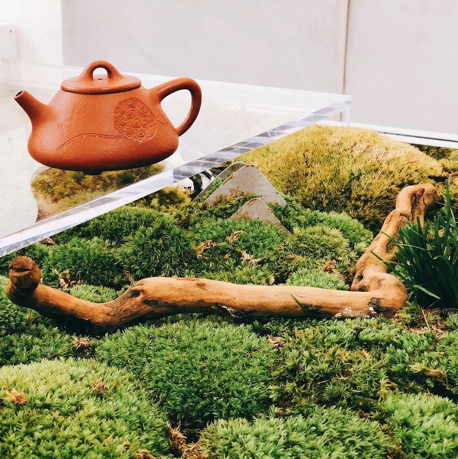穿过一条安静小走廊,走廊尽头左手边是茶杯茶壶的陈列处,右手边则是最吸引人眼球的一个四方小庭院。