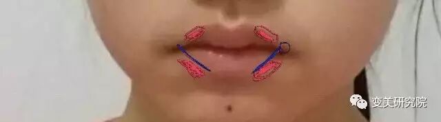 在粉色部位涂上遮瑕,将唇角的位置设定在比原来唇角略高的地方,用粉底或遮瑕膏遮盖下嘴角的轮廓,上下唇线都从那一点开始画成自然的弧形,下唇先向上弯曲,上唇线向下弯 曲,使嘴角看起来向上翘。