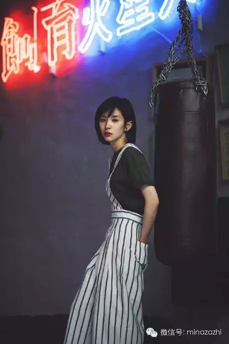 墨绿色的上衣稍显沉闷,但是一条竖条纹的背带裤轻松打破沉闷感,大大提升造型的时尚度!