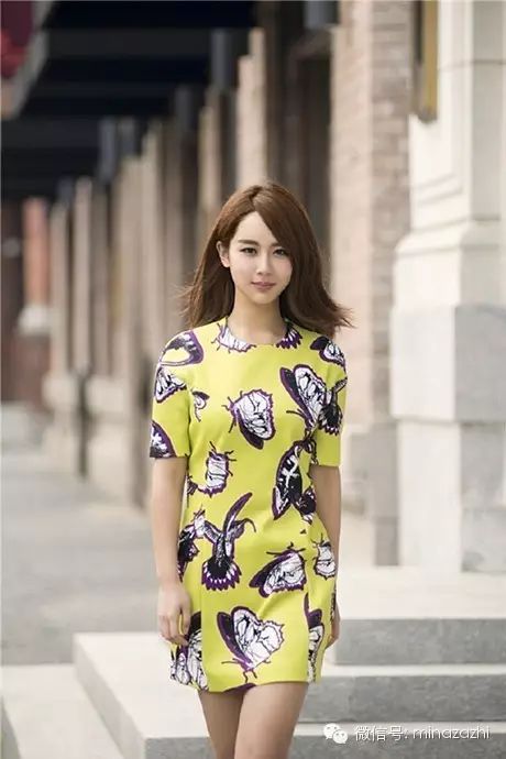 荧光绿的连衣裙非常的抢眼,身上点缀满蝴蝶的印花绽放出精灵般的美!