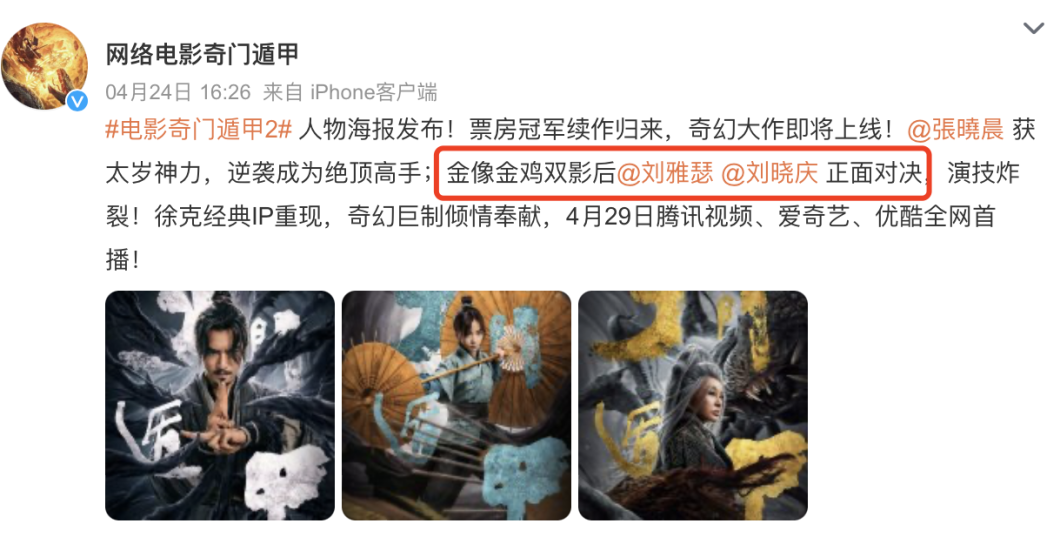 和新晋金像奖影后刘雅瑟拍摄的《奇门遁甲 2》刚上线,又忙着和人气小花宋祖儿合作电视剧《折腰》;