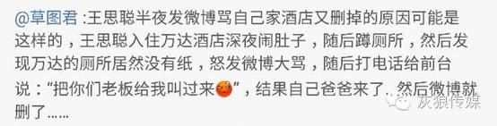 【王思聪长沙选女神 深夜吐槽自家酒店】王思聪昨天在长沙录制节目后下榻万达酒店,凌晨发微博怒斥自家酒店:“长沙万达酒店是我住过的最sb的酒店,还tm是自己开的!”[衰]“我生气起来我自己都骂”,可以,这很王思聪