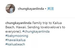 28日,下午钟嘉欣在Instagram上贴出两张照片并写下,“Family trip to Kailua Beach, Hawaii. Sending lovelovelove's to everyone:). #babymooning”