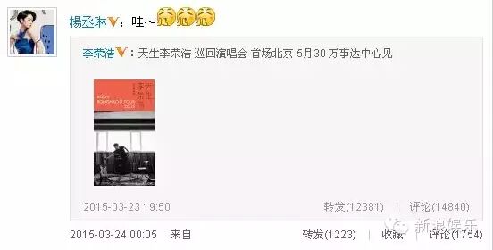 3月23日,李荣浩在微博上为自己的巡回演唱会做宣传,第二日凌晨,杨丞琳就转发微博为其加油,不畏惧绯闻力挺李荣浩!