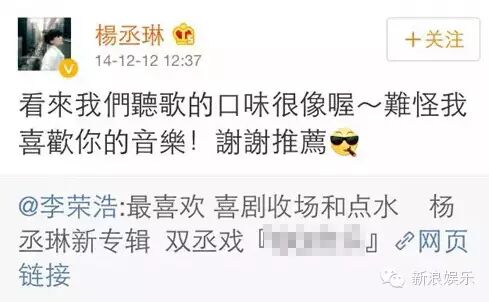 14年12月12日,李荣浩在微博上表示喜欢杨丞琳的歌,并推荐她的新专辑...