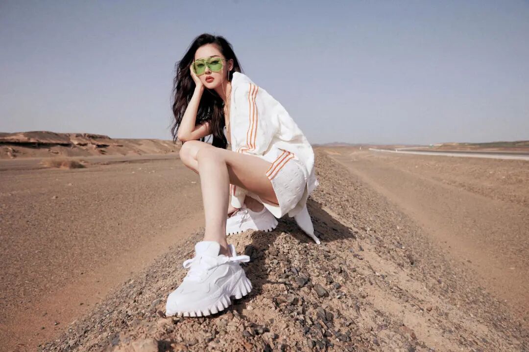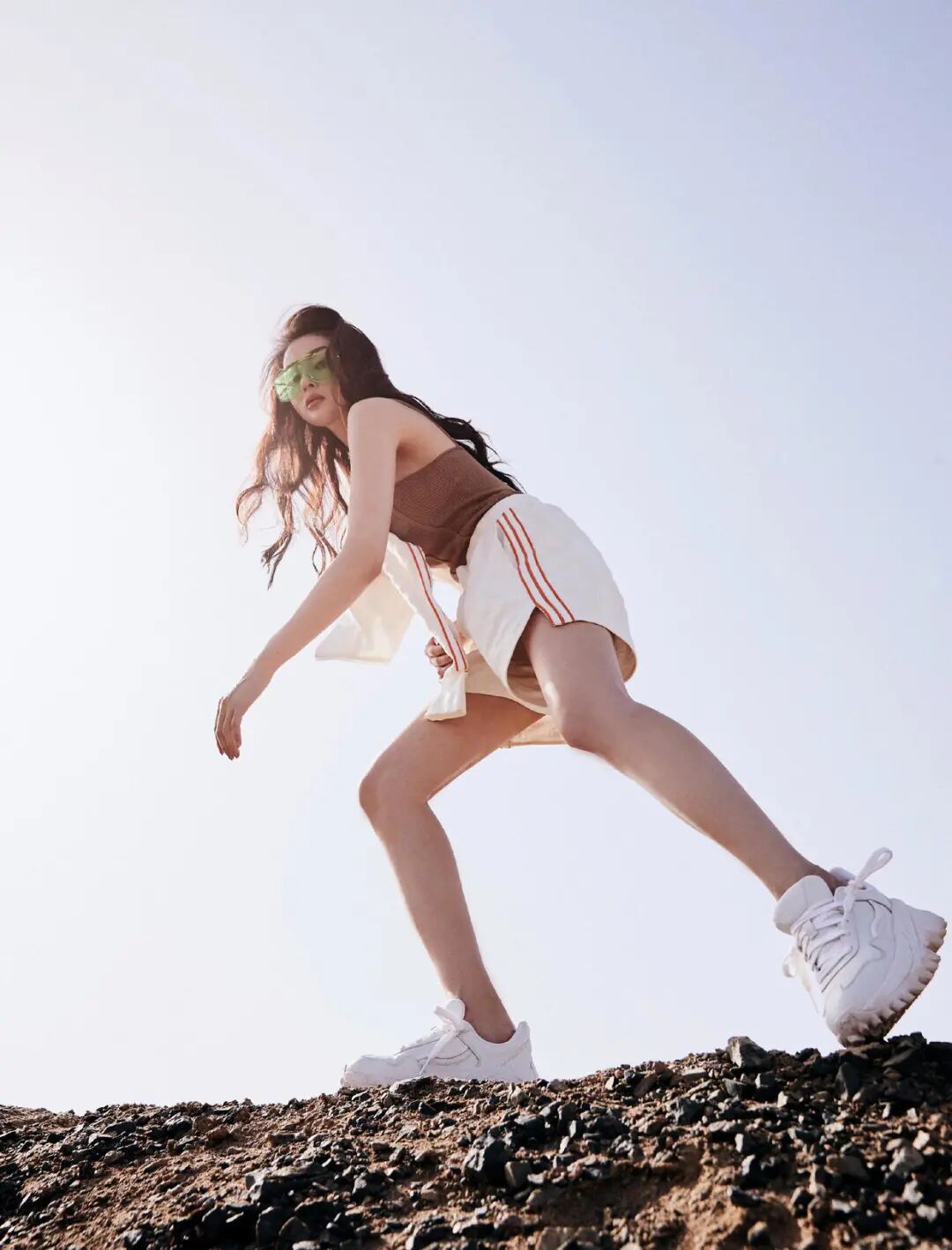 整体的行动风相对猛烈,因此张天爱为本人搭配了一双白色行动鞋来强化样式。