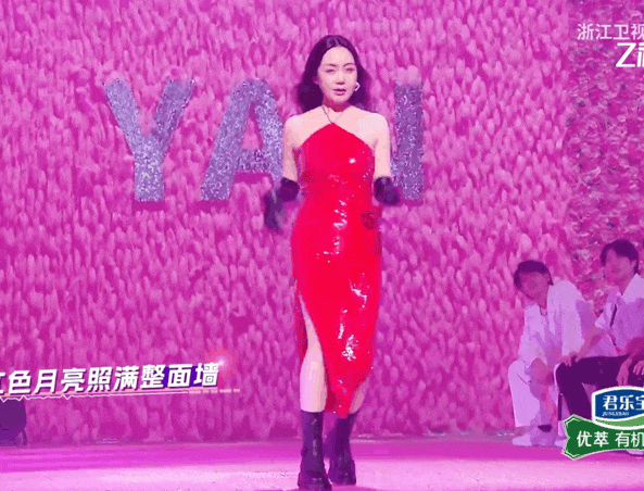 穿一身挂脖贴身红裙,献上一曲热辣的《屋顶着火》,舞步妖娆,歌喉慵懒,主打一个天性解放。