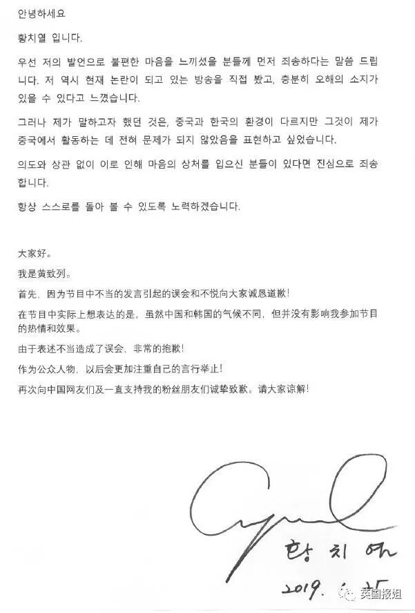 随后,黄致列也不出大家所料,用中韩双语发布了道歉信,表示自己的本意并不是黑中国。(但你确实黑了)
