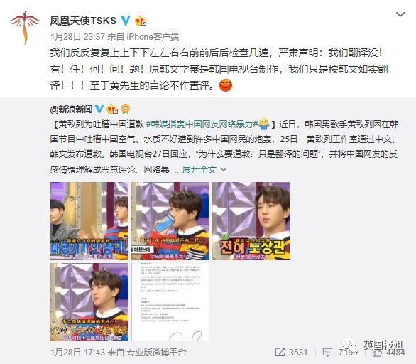 据媒体称,在事发后韩国MBN电视台针对这件事专门发了一篇文章,认为黄致列根本就没有错,为什么要向他们道歉,是翻译的问题。