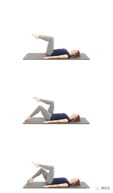 1. 吐气,把左腿抬起呈90°角(桌面式),核心发力。2. 吸气,左脚尖放下,边吐气边抬起右腿3. 吐气,把右腿抬成桌面式,核心发力。4. 吸气,右脚尖放下,边吐气边抬起腿。* 小提醒:慢慢做,这样才能控制好你的所有动作,也才能让身体的核心很好地发力。