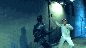 马上李连杰说“子丹,你流血了。”还加了一句“老地方,就在眉毛上。”甄子丹也按着伤口抱怨“你怎么老和我的眉毛过不去。”