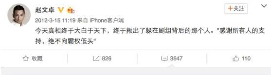 赵文卓则是发微博说:真相终于大白于天下,终于揪出了躲在剧组背后的那个人。“感谢所有人的支持,绝不向霸权低头”。