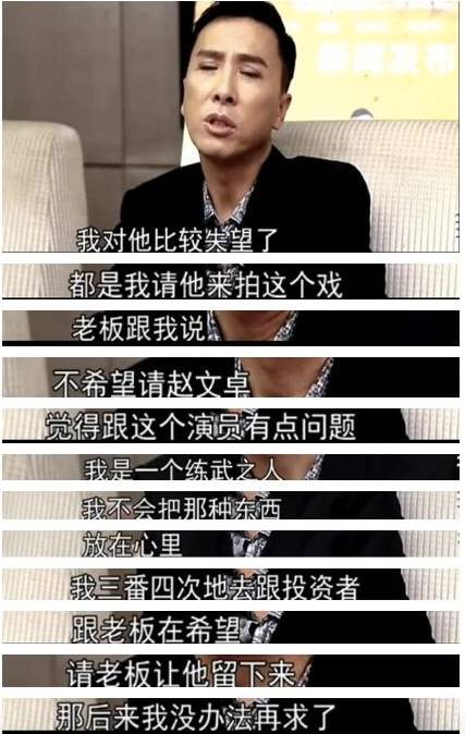 而赵文卓给出的理由,是甄子丹作为监制,利用自己的权利,不遵守合约条款规定,私自修改他的戏份。之前签的是双雄类型的电影,结果赵文卓却彻底变成配角。