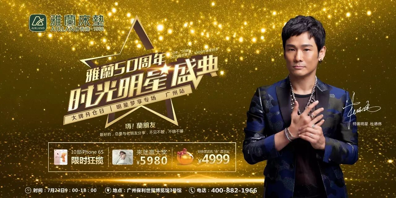 星光十足的时光蘭神!杜德伟&雅蘭床垫大牌联袂,回望时光、回唱经典,明星时光秀,经典老歌唱不停。亲临现场,即有机会参与明星互动、竞猜合影,留驻美梦。