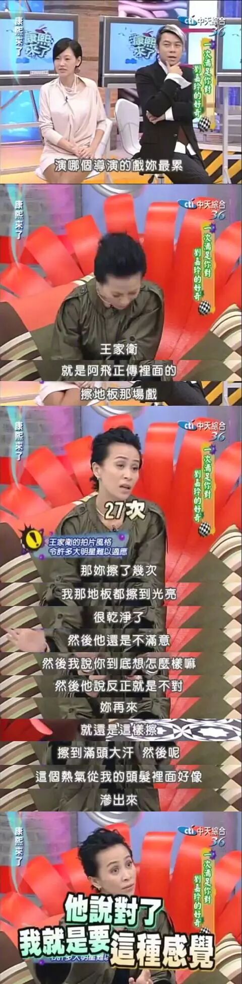 刘嘉玲跟王家卫合作拍摄剧情片《阿飞正传》时,也同样表示很心累,当时刘嘉玲在《阿飞正传》里面拍摄擦地板这小段戏,为了追求最好的效果,王家卫要求刘嘉玲连续擦了27遍,而且事先连他都不知道演员怎么扮演才最好,最后还是刘嘉玲累到冒汗才达到了王家卫想要的效果。