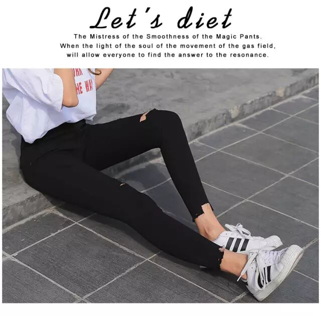这次小美推荐的两款魔术裤,一款是纯黑色的经典款,还有一款是黑色破洞裤,材质都一样,就是破洞的差别。