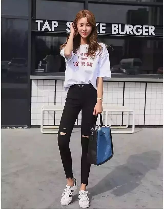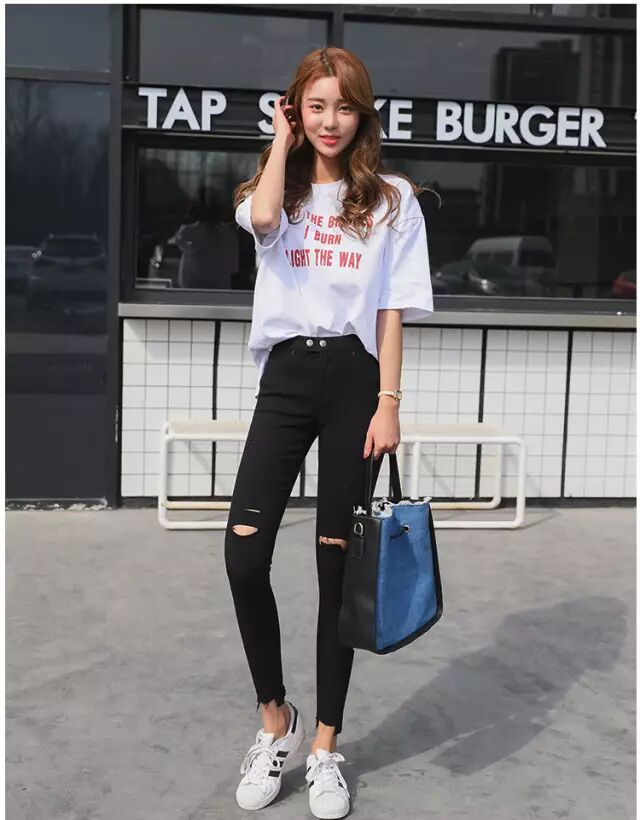 腿型不够完美的妹子,可以尝试这种膝盖处割破设计的款式,让视线转移到膝盖和破洞上,腿看起来就没那么弯了。