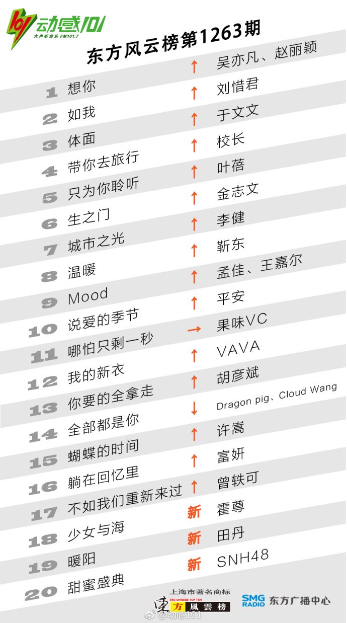 (BY DJ 罗毅)1263期《东方风云榜》由吴亦凡创作、与赵丽颖合唱的《想你》,以非常具有洗脑功力的副歌旋律获得歌迷的认可,摘得榜单冠军。