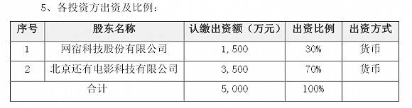 公告显示,网宿快线注册资本为5000万元,其中公司以货币出资1500万元,占注册资本的30%;还有电影以货币出资3500万元,占注册资本的70%。
