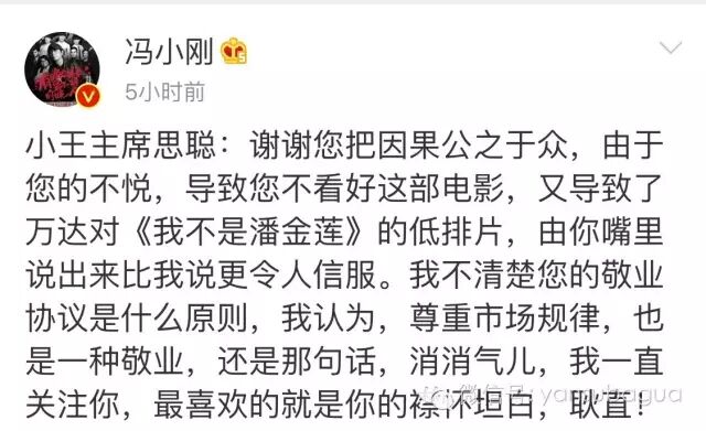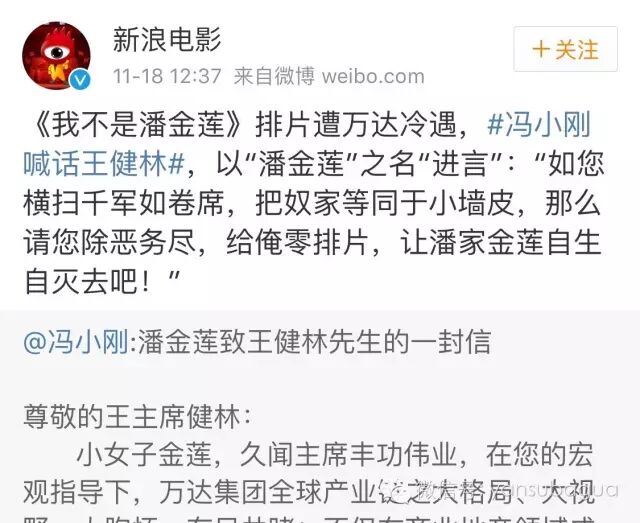 冯小刚以“小女子金莲”自称,像王健林喊话。