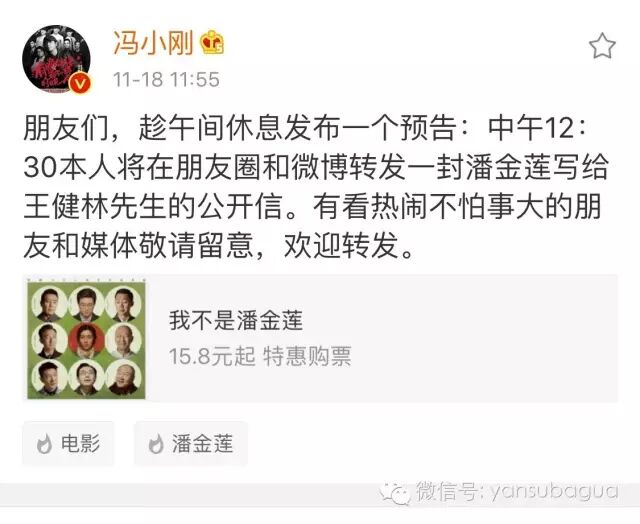事情是这样的,11月18日中午冯小刚先发了条预告,