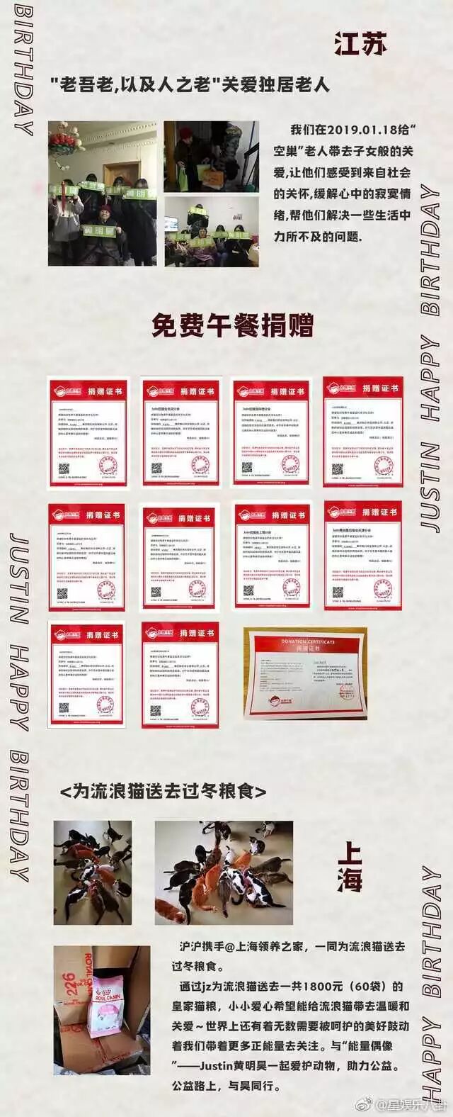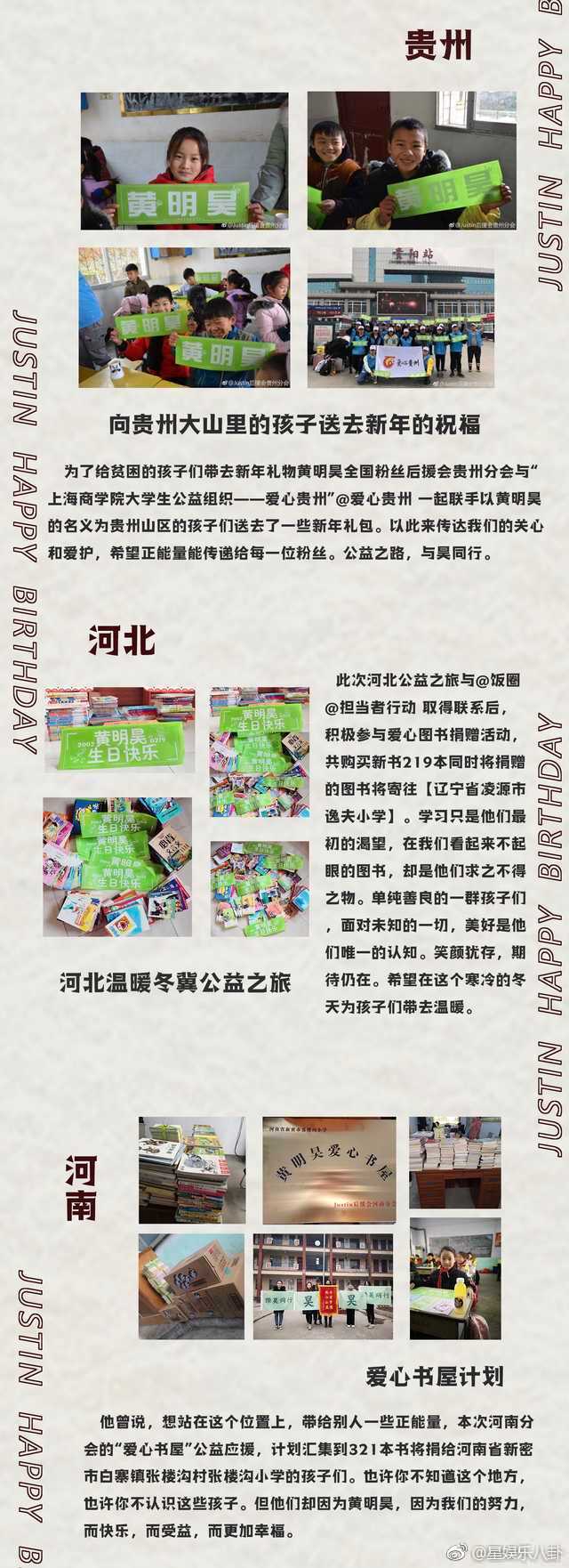 而粉丝们在生日之际,举办了很多的公益活动,进行了捐赠,帮助了很多需要帮助的人,以此为黄明昊的生日应援。