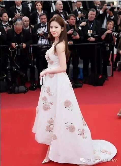 刘亦菲身着Christian Dior为其特别订制的花朵刺绣裙亮相戛纳国际电影节开幕式红毯,她也是章子怡之后第二个享有该礼遇的中国女星。