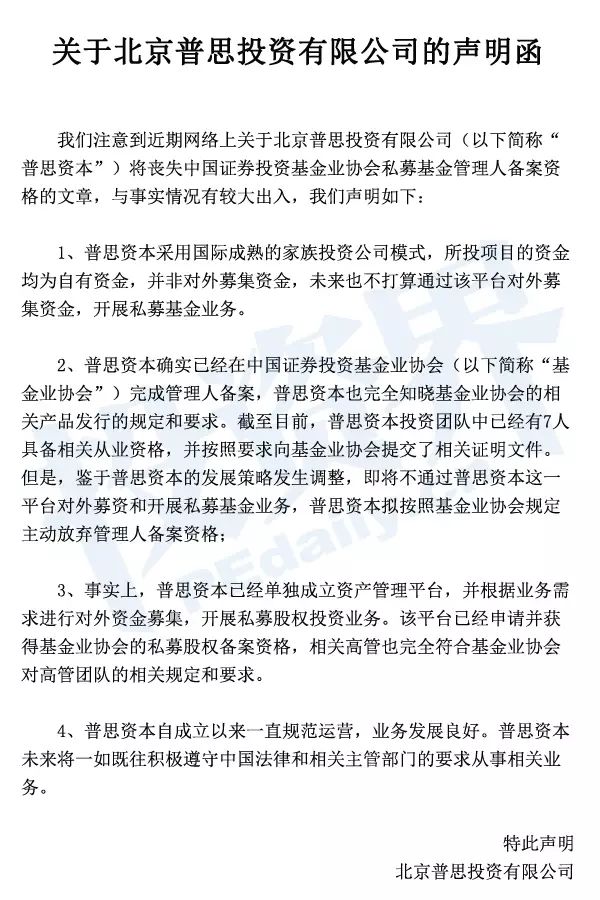 3. 另外,普思资本单独成立了资产管理平台,开展对外募资和私募股权投资业务,而且也已经完成备案了。