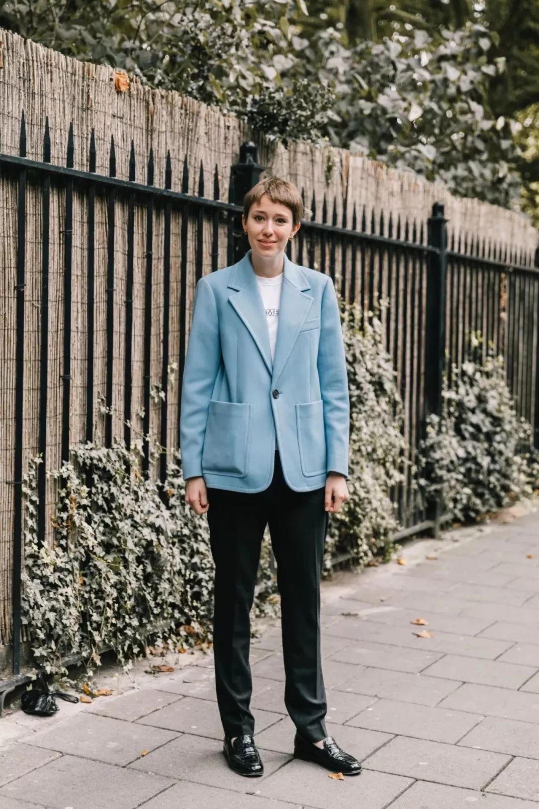 黑色西装裤,搭配精致简约乐福鞋,才能让蓝色西装变得更有腔调和经典气质。