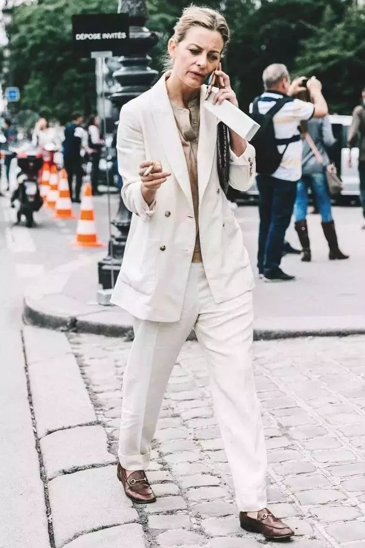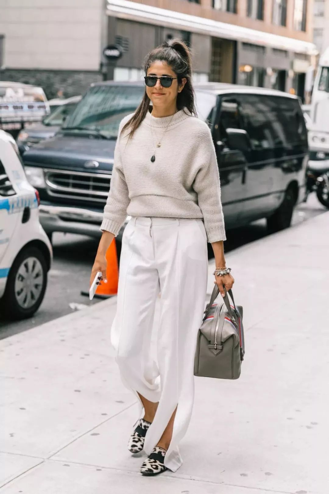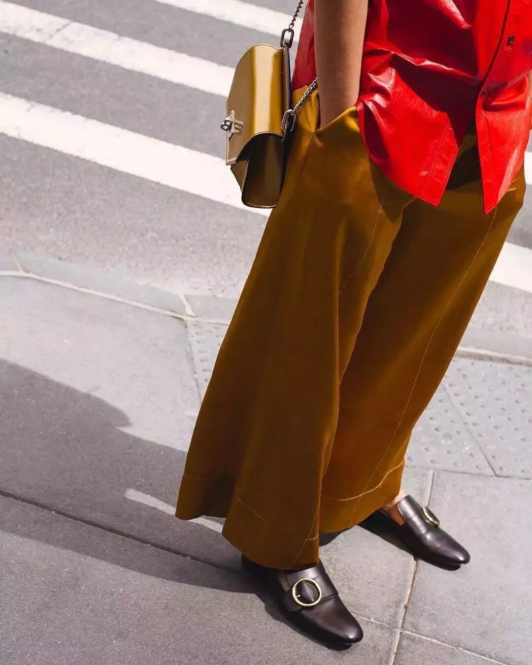 还有今年格外流行的开叉阔腿,设计感十足,搭配平底鞋别致有趣。灵动的裤脚选择乐福鞋不丢时髦不输气场。
