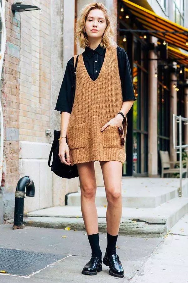 样式简单的便士乐福鞋+黑色短袜+针织背心裙,让整个造型更有年轻的校园感。