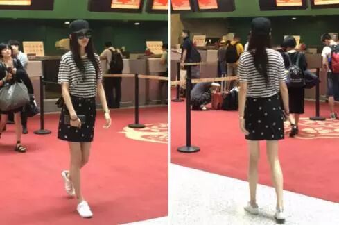 亮相机场的唐嫣以Alexander Wang条纹T恤搭配星星印花半裙和小白鞋,筷子腿超吸睛