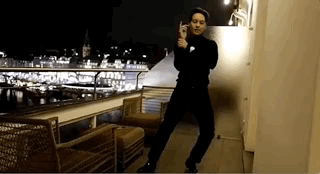然后干脆地随着音乐,在颇有些寒意的室外长廊上突然地律动起来。