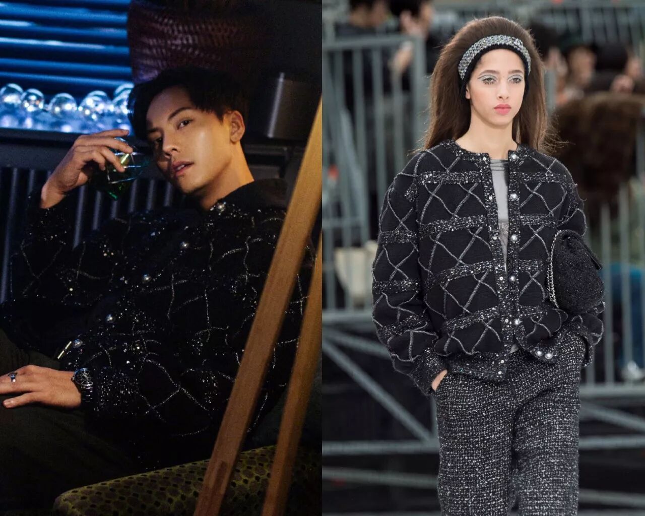 他端着酒杯朝镜头放电时穿的那件黑色针织外套,又来自CHANEL 2017秋冬系列,本就宽阔的肩型和袖口放到积极健身的陈伟霆身上,反倒成了一件合身的茧形外套。