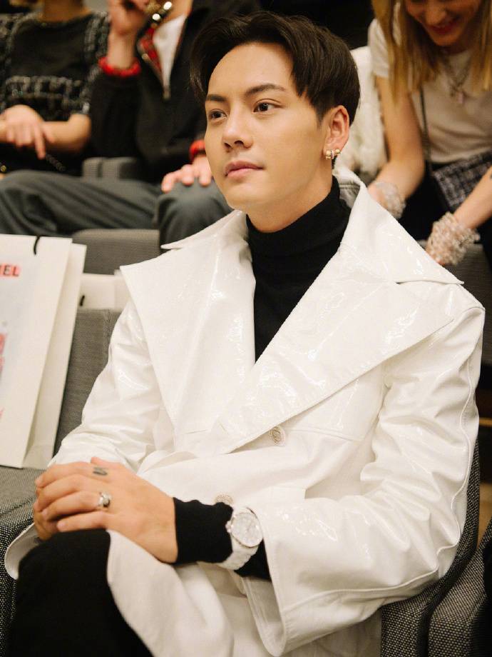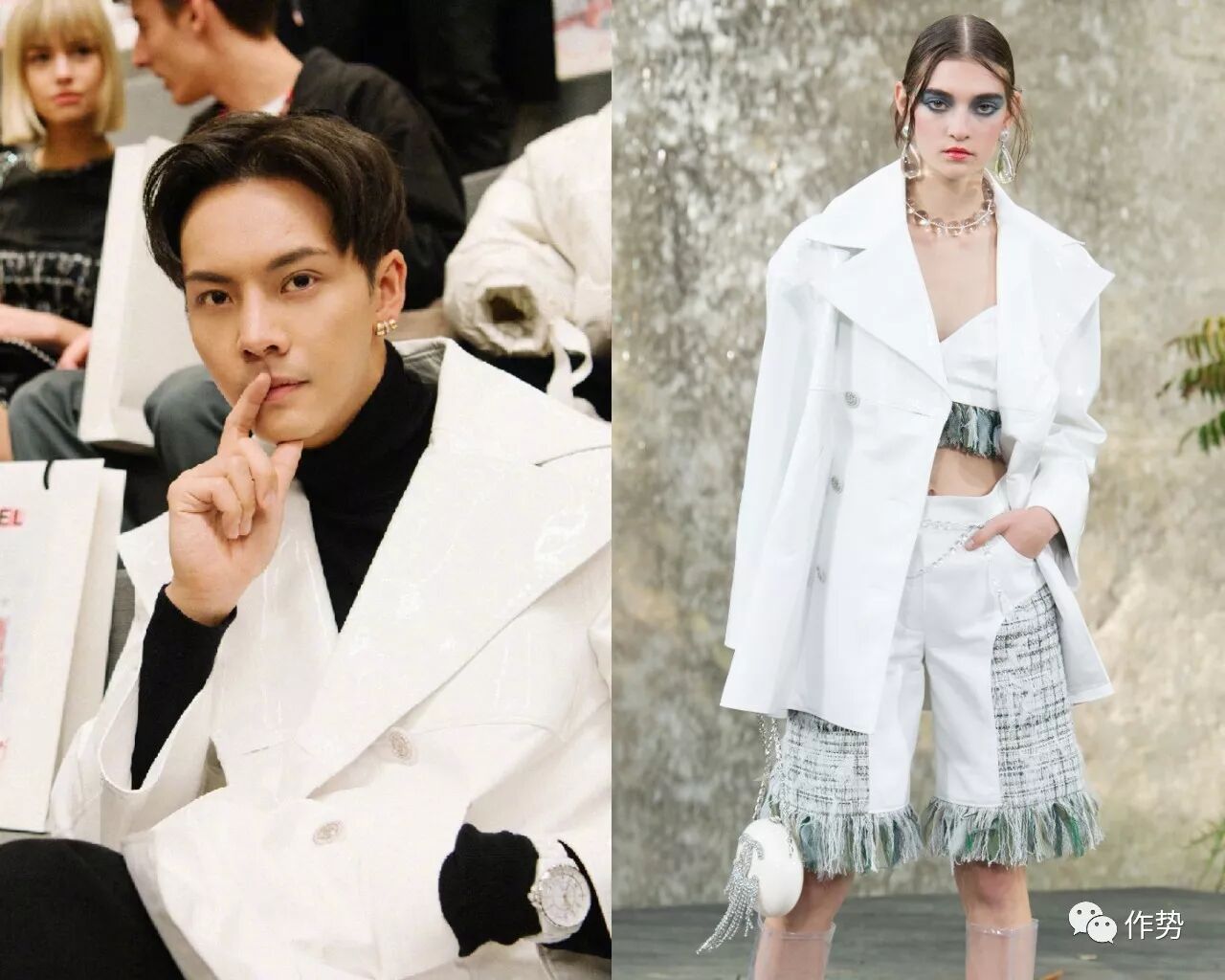 这次他在德国看秀时穿的那件白色漆皮外套,就来自CHANEL 2018春夏女装系列,模特诠释起来颇有几分秀致的款式,来到陈伟霆身上丝毫不显违和,反倒有种白马王子的清新感。