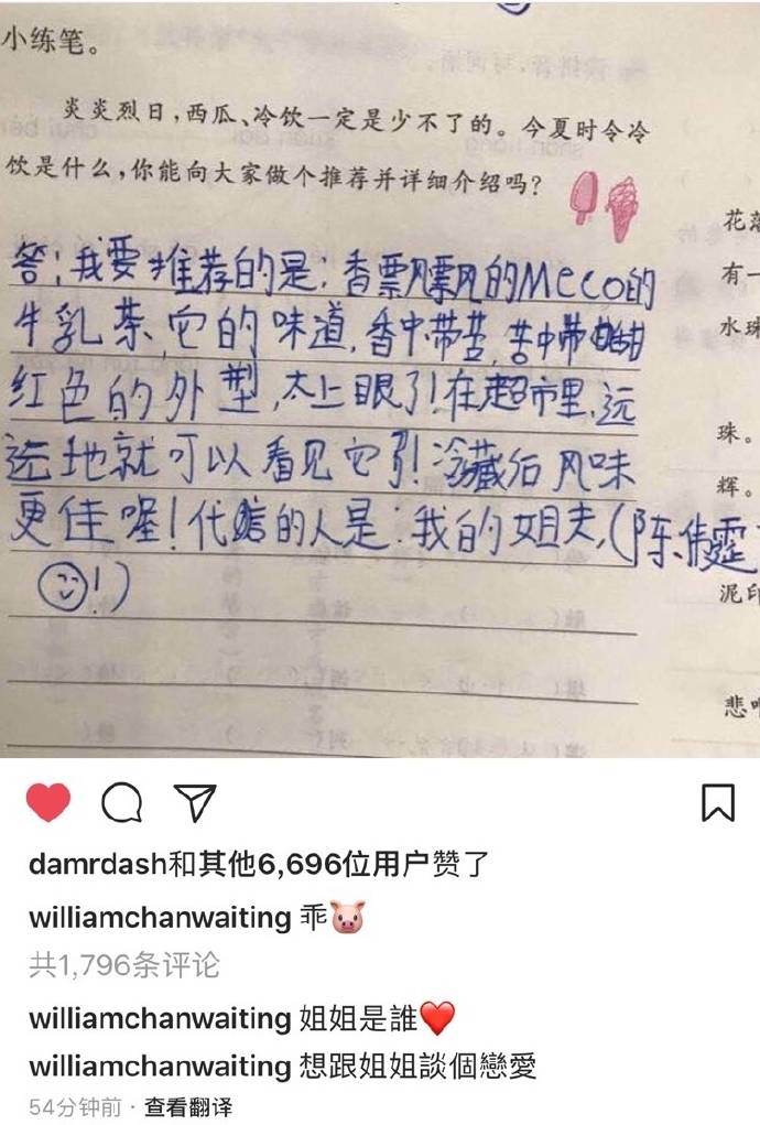 还有女粉丝和弟弟说要嫁给陈伟霆,弟弟顺手把这段话写到了作业里,粉丝把这段童言童语拍下来发到微博上@给陈伟霆,结果他竟然直接把图po到自己Instagram上,还说“想跟姐姐谈个恋爱