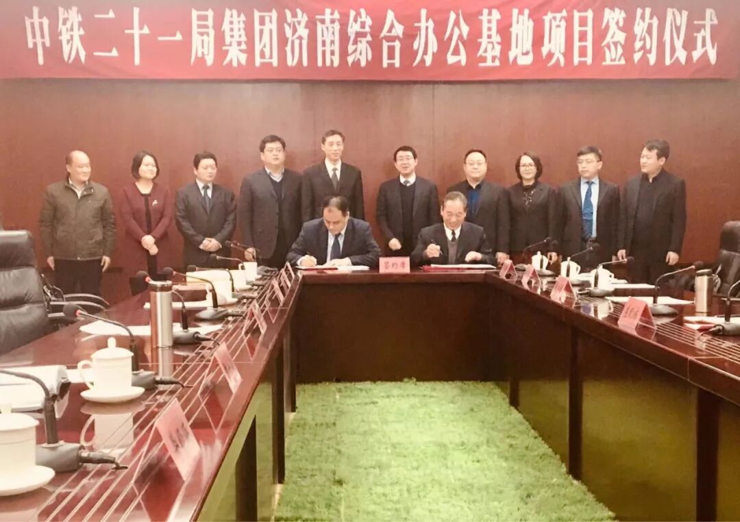 2018年,中铁二十一局集团济南综合办公基地项目战略框架合作协议于2月8日农历小年,在济南市历城区举行。集团公司党委书记庄纪栋,副巡视员李让平和发展规划处、资本运营处、行政办公室、财务处、宣传部,冀鲁指挥部,轨道公司,路桥公司,德盛和置业公司负责同志以及历城区人民政府区委副书记、区长刘科,区委常委、常务副区长张庆国,区政府办公室、国土分局、投资中心等部门负责人共同见证了新时代这一企地合作的难忘时刻。