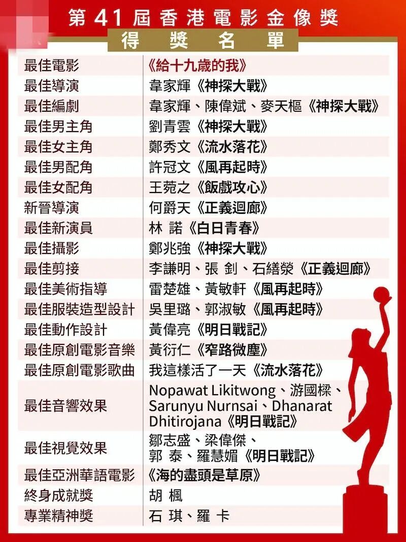 4月16日晚,第41届香港电影金像奖颁发奖项,郑秀文击败张艾嘉、毛舜筠等资深女演员,凭小众影片《流水落花》首度获得影后,刘青云则凭着《神探大战》第三度夺得金像奖“最佳男主角”。