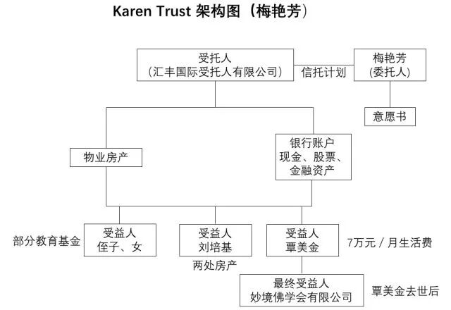 梅艳芳在去世前27天,也就是12月3号的早上,在医院的病床上完成了遗嘱和一个生前信托的设立。这个信托以梅艳芳的英文名命名,叫做Karen Trust。当时为其提供会计专业服务的是香港罗兵咸永道会计师事务所,即普华永道集团在香港的成员会计师事务所。提供专业信托受托人的,则是汇丰国际受托人有限责任公司(HSBC International Trustee Limited)。
