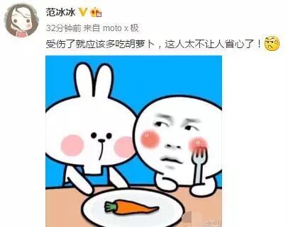 [摘要]范冰冰今日一早更新微博配文写道“受伤了就应该多吃胡萝卜,这人太不让人省心了”。