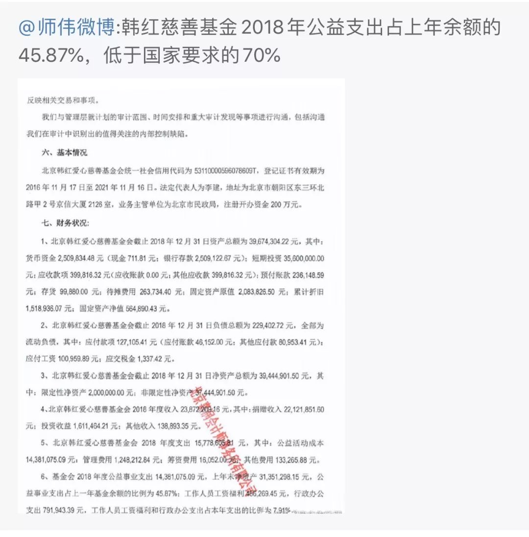 “韩红慈善基金2018年公益支出占上年余额的45.87%,低于国家要求的70%”。