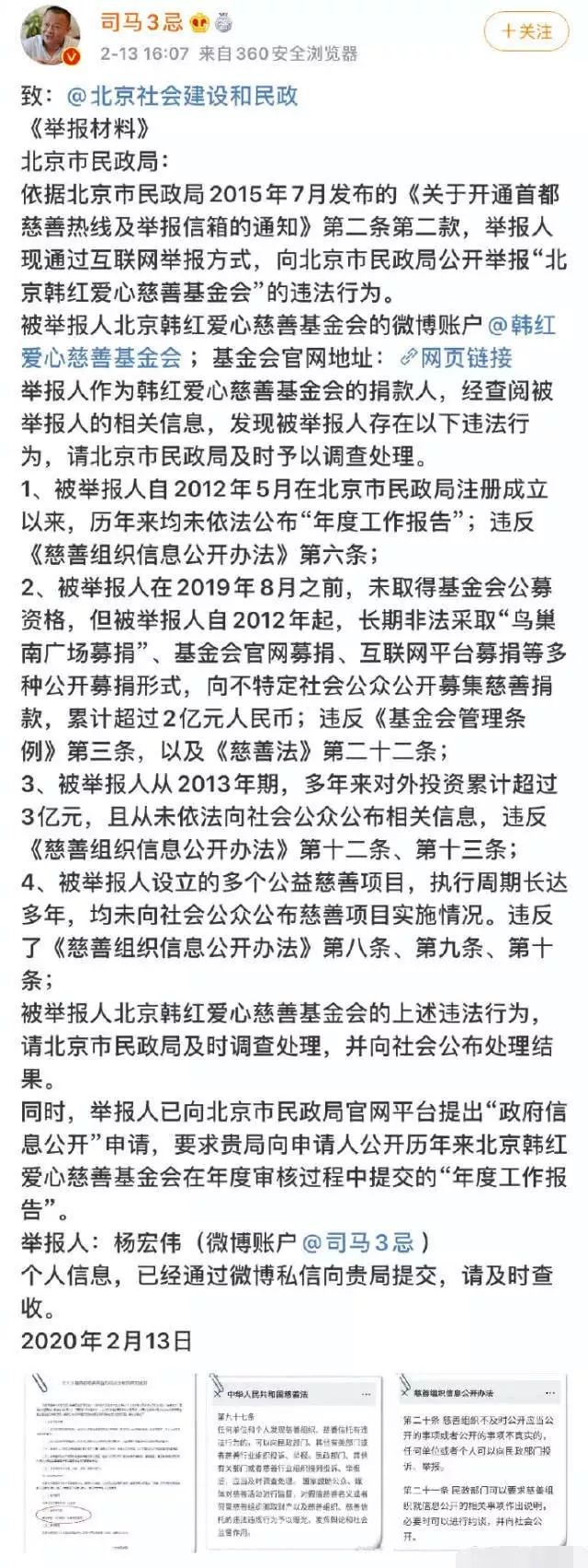 举报者实名举报韩红及其名下公益基金,具体如下: