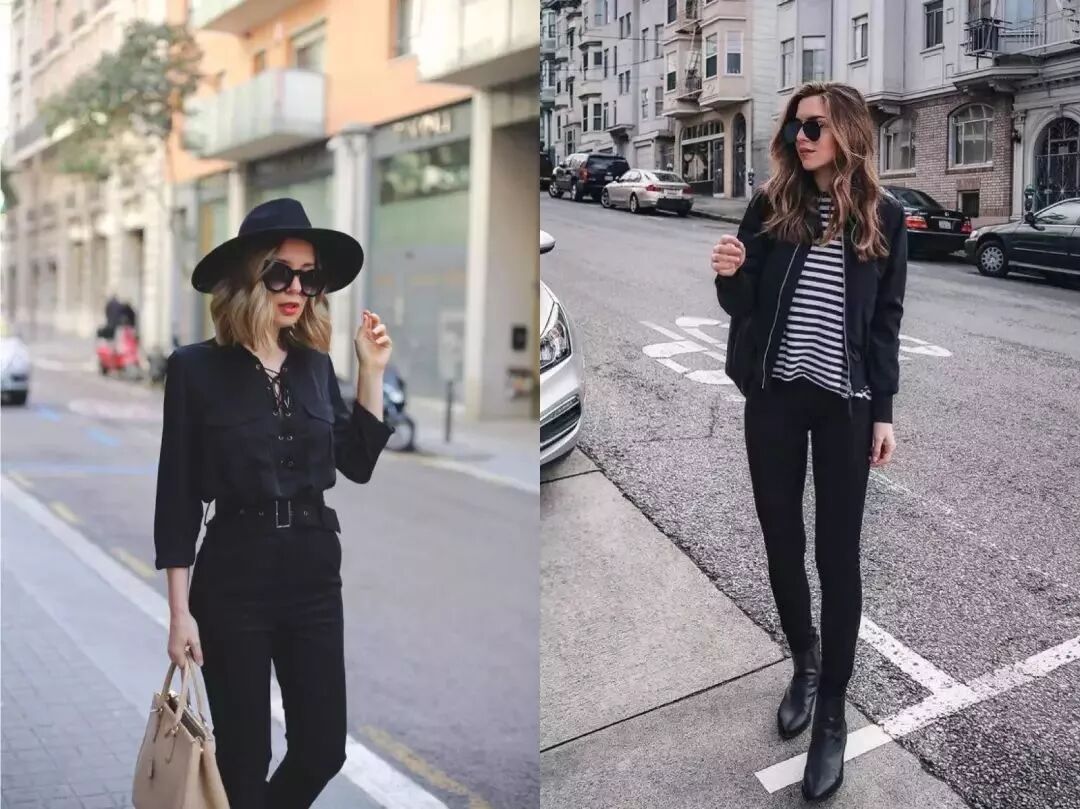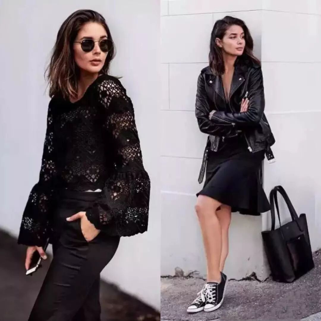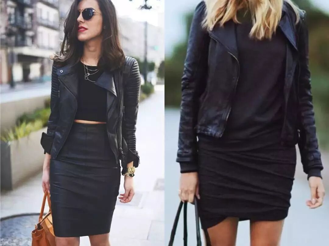不动脑就赢很大的搭配就是all black和皮夹克,帅气十足,而且非常显瘦。不过个人感觉这种穿法不适合日常上班,出门约个会逛个街最为合适。