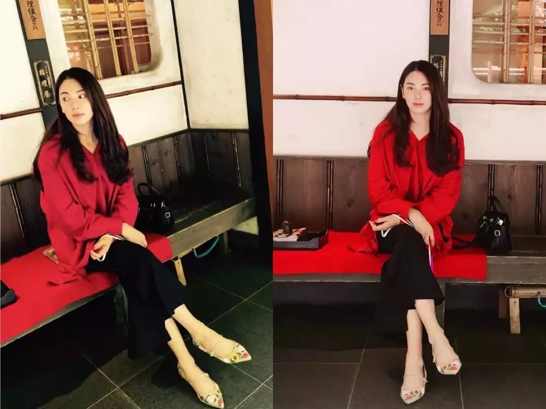 阔腿裤了,既显瘦又有气场。张雨绮一身红色衬衫搭配黑色阔腿裤,虽然没有裙子的衬托却女人味十足,上班约会都很合适。