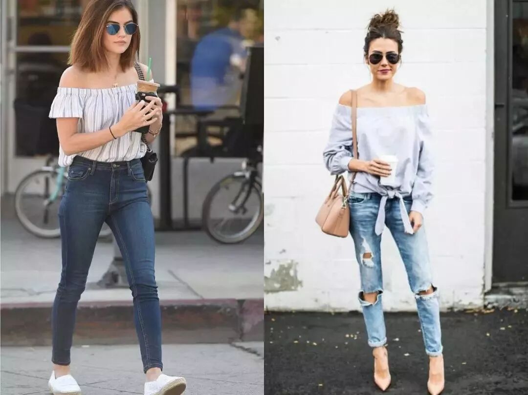 4、一字肩+牛仔裤